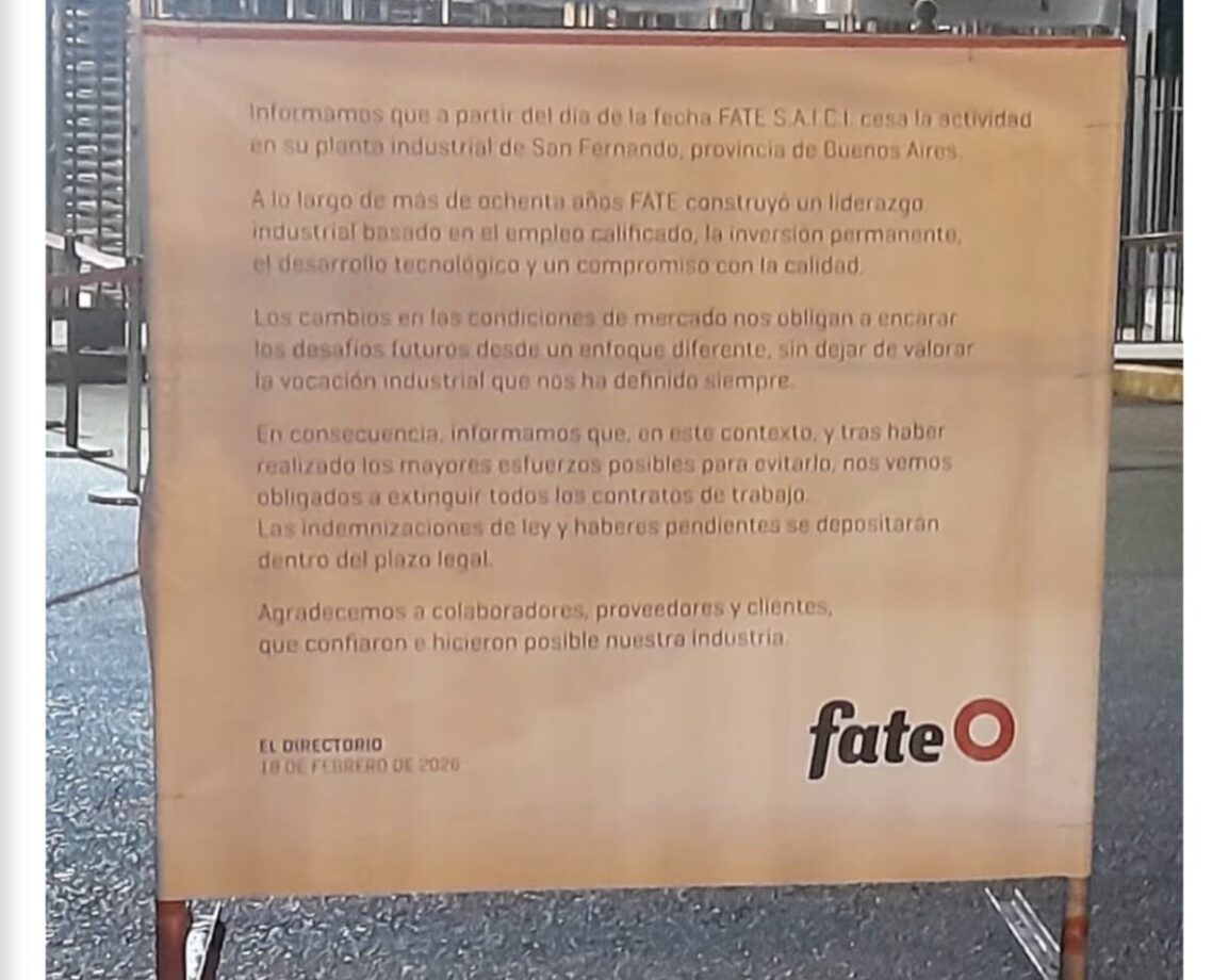 18 febrero, 2026Con una cruda declaración pública que demuestra los daños del modelo económico del gobierno de Javier Milei en la producción nacional, la histórica fábrica de neumáticos Fate anunció su cierre definitivo tras 80 años de vigencia y el despido inmediato de 920 trabajadores de su planta ubicada en el partido bonaerense de San Fernando.