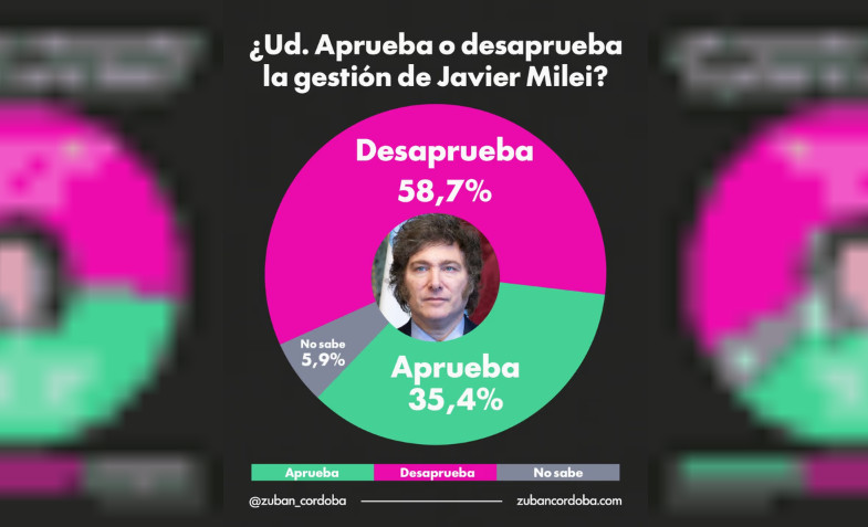 Si antes los relevos solían separar más el enojo por el rumbo de la gestión al Gobierno y blindar la figura de Milei, esto también comienza a erosionarse.  Ante la pregunta de Zuban- Córdoba si la población aprueba o desaprueba la gestión del Presidente de la Nación, el 58,7% dijo que desaprueba y solo el 35,4% contestó aprobarla.