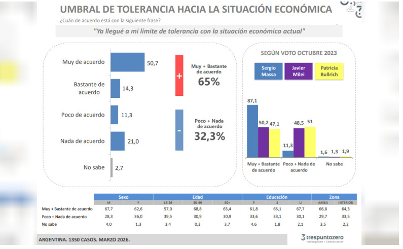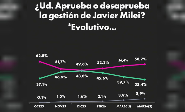 “En diciembre del 2025, el 48,9% aprobaba la gestión del mandamás nacional y en ese momento la imagen negativa era del 49,6%. Ahora, la aprobación es del 35,4% y la desaprobación del 58,7%”, argumentan desde Zuban Córdoba, que expresó una brecha negativa de 20 puntos entre la aprobación y la desaprobación.