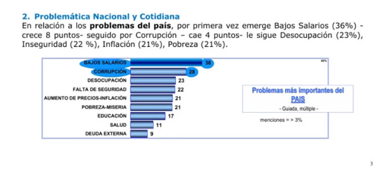Como novedad para este estudio, por primera vez en la serie, el rubro “Bajos Salarios” (36%) se impuso como el problema más importante del país, superando a la Corrupción (28%) y a la Inflación (21%).