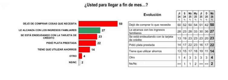 El impacto de los problemas económicos en la vida cotidiana es una parte clave del relevo de Haime. El 50% de los encuestados afirmó que debió dejar de comprar cosas que necesita para llegar a fin de mes. Además, un 37% de la población se encuentra endeudada, por el uso de la tarjeta de crédito o pidiendo préstamos personales.